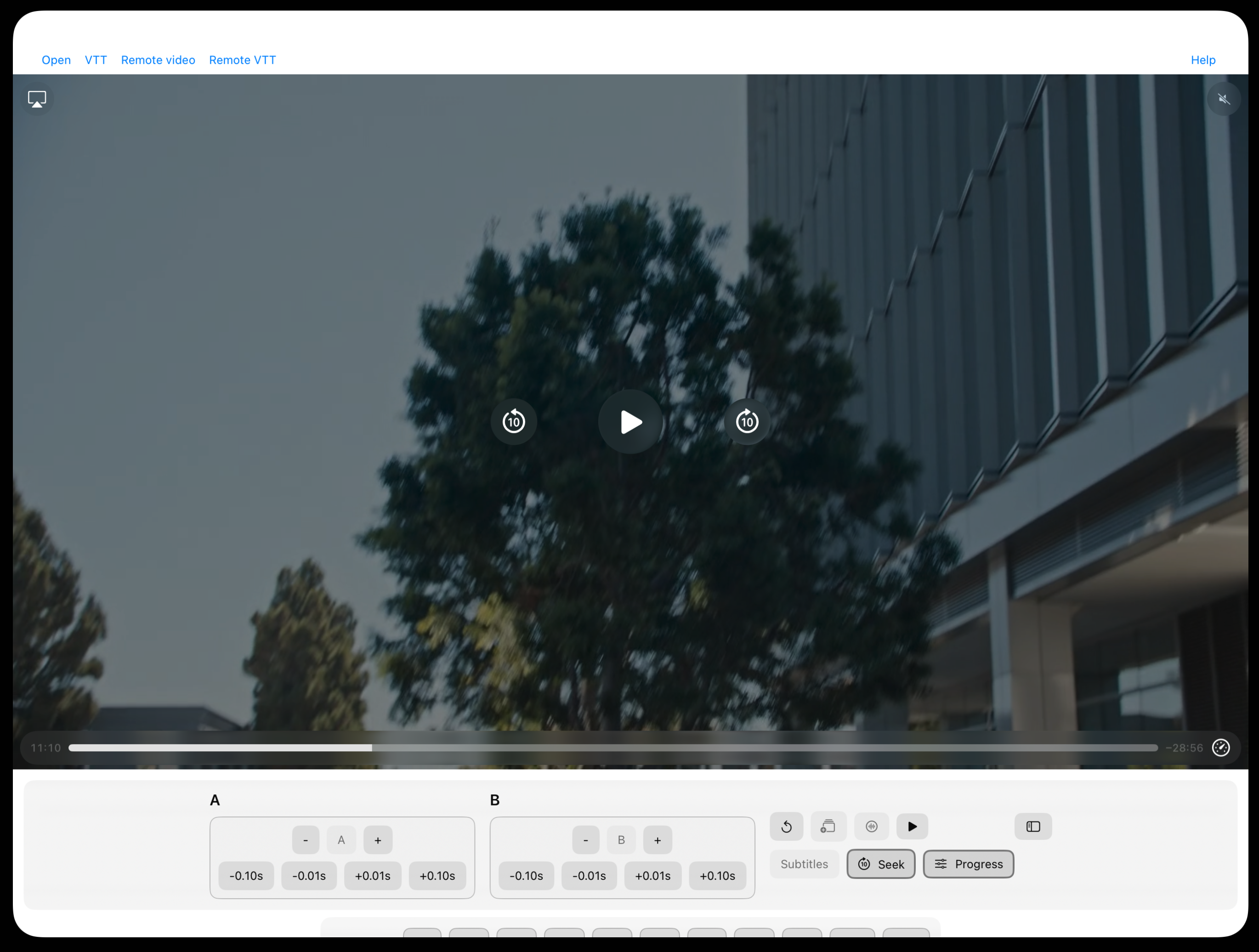 MP4 video and VTT subtitle files only. Load from local storage or remote sources. MKV format not currently supported.